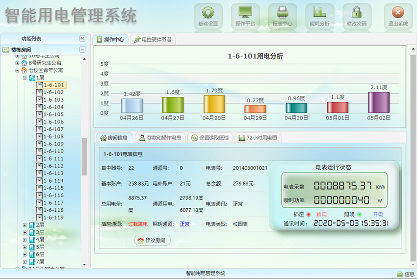 實(shí)時(shí)監(jiān)控:對(duì)每個(gè)學(xué)生房間的用電情況進(jìn)行實(shí)時(shí)監(jiān)控,直觀顯示學(xué)生房間當(dāng)前的用電數(shù)據(jù)(當(dāng)前電流、剩余電量、已用電量、用電情況等),并且支持多種展現(xiàn)形式;